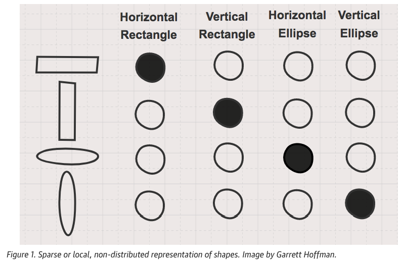To illustrate the concepts of sparse and distributed representations, we can use a simple shape example. In the above Figure, four shapes and their names are shown. The target shape’s name is represented in black, and the other shapes’ names are left blank. In this method, the number of shapes corresponds to the number of features (i.e., dimensions), and each feature is independent.